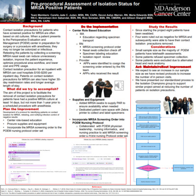 A quality improvement initiative to identify pre-procedural patients with a prior MRSA-positive status and retesting prior to a procedure scheduled with anesthesia, aiming to reduce unnecessary isolation precautions and improve patient care efficiency.