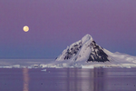 Image Description: A snow-covered mountain peak rising from icy waters under a purple twilight sky with a full moon visible on the left. Reflection of moonlight and icebergs can be seen on calm water, highlighting a serene polar landscape.