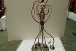 "Upside down lamp top creates the legs, a concrete doll head, a non-working small old appliance makes the body, All recyclable pcs. create an alien superhero"