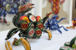 Beer bottle caps and recycled dry-clean hangers rescued from the dumpster.