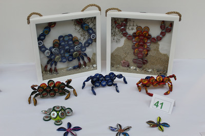 Beer bottle caps and recycled dry-clean hangers rescued from the dumpster.