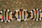 Double Helix made from plastic bottle caps and metal bottle caps glued on a 30x40 plywood sheet donated from a construction site. Materials: super glue, plastic and metal caps, 30x40 plywood.