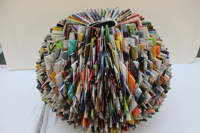 "Each page was folded into a triangle shape; each paper triangle was linked to each other and glued into the lantern creating this paper sphere art piece."
