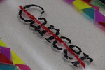 This piece is a glass pane decorated with pieces of recycled plastic (laundry detergent lids, plastic placemats, a clipboard, clear plastic folders, and a plastic pencil container) to imitate the effect of stained glass and mosaic. The center of the piece is a mosaic of the before mentioned recycled plastic that creates the MD Anderson logo. The glass pane is affixed into a wooden frame with glue and is able to be hung with a metal wire. The recycled materials were sourced from the Texas Art Asylum, an art supply store that sells recycled materials to use in creative ways.