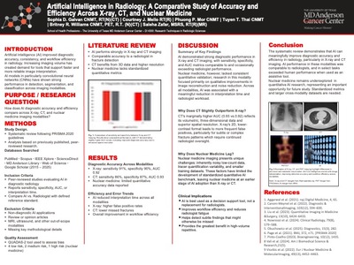 Artificial intelligence (AI) is increasingly used in radiology to improve diagnostic accuracy and workflow efficiency; however, there is limited standardized research comparing its performance across imaging modalities. This study aimed to evaluate the accuracy and efficiency of AI in X-ray, computed tomography (CT), and nuclear medicine. A systematic review was conducted following PRISMA guidelines, analyzing peer-reviewed studies published between 2015 and 2025. Data were extracted on key performance metrics, including sensitivity, specificity, interpretation time, and error rates, to enable cross-modality comparison. Results demonstrated that AI achieved high diagnostic accuracy in X-ray imaging, with average sensitivity and specificity near 91% and 90%, respectively, though it still had limitations in detecting subtle findings. In CT imaging, AI showed comparable specificity and slightly lower sensitivity while improving the detection of volumetric data and lesions. Nuclear medicine applications primarily demonstrated qualitative benefits, including improved image reconstruction and noise reduction, but lacked standardized quantitative metrics for direct comparison. Across modalities, AI consistently reduced interpretation time and improved workflow efficiency, although variability in study design limited full comparability. Overall, AI serves as an effective clinical decision-support tool that enhances radiologist performance rather than replacing it, highlighting the need for standardized evaluation frameworks and expanded research in nuclear medicine.